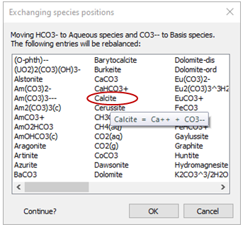 To rebalance the mineral calcite in terms of the carbonate ion, rather than the basis species bicarbonate, click the swap button next to “HCO3-”, then choose Aqueous… → “CO3--”