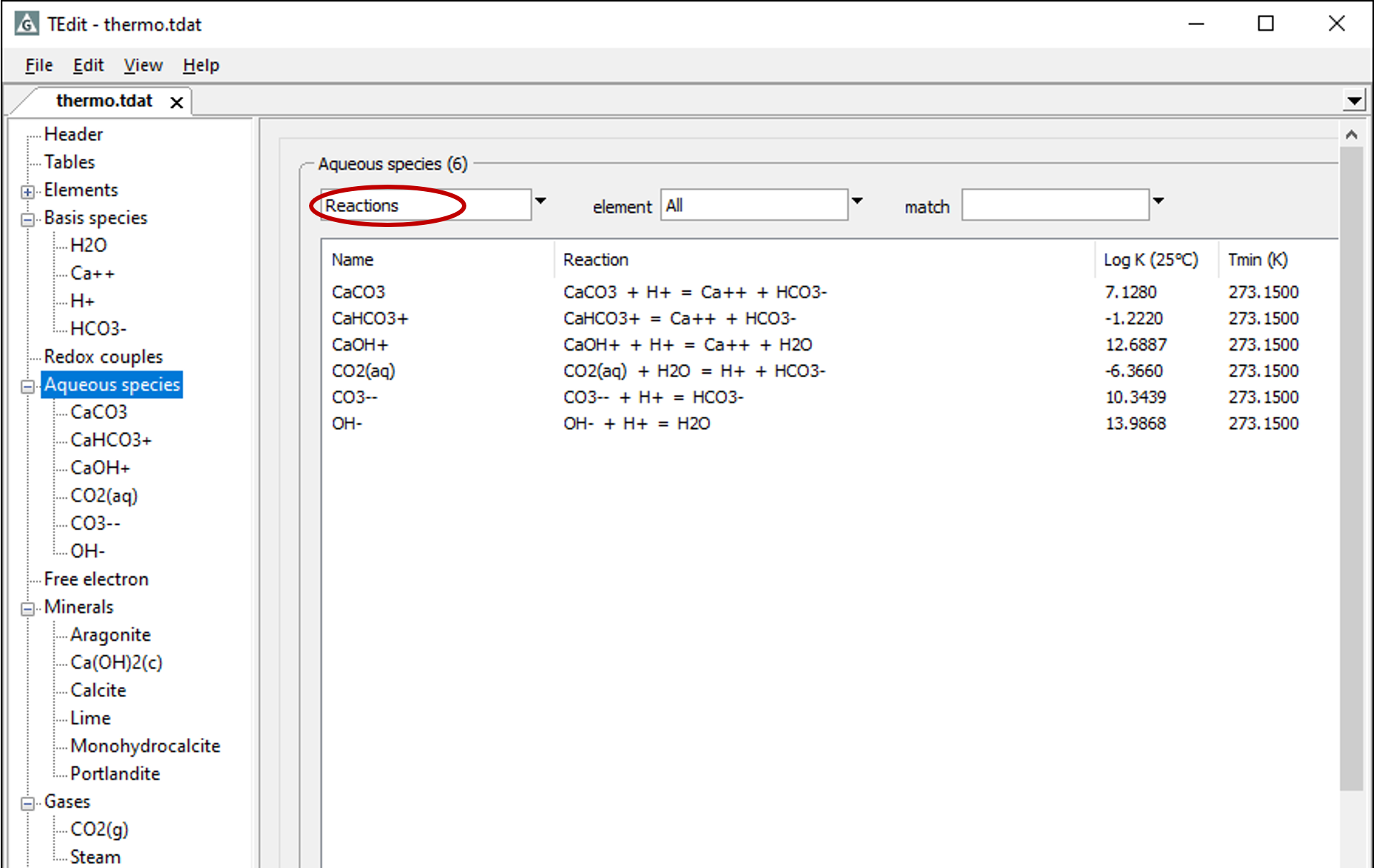 Expanding the sections in the tree, we see a concise dataset. A summary of the reactions for all secondary aqueous species is shown below.