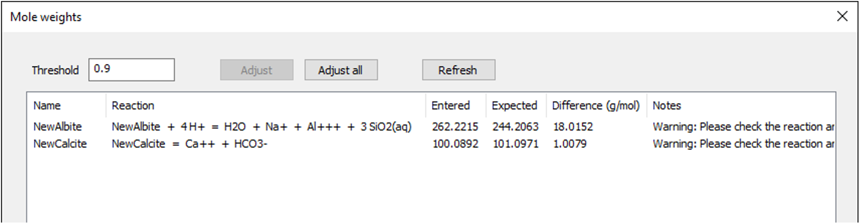 Adjust the threshold to a smaller value for finer adjustment. Different sources often use slightly different mole weights for various elements and species, so the dialogue allows you to find small discrepancies and make corrections.